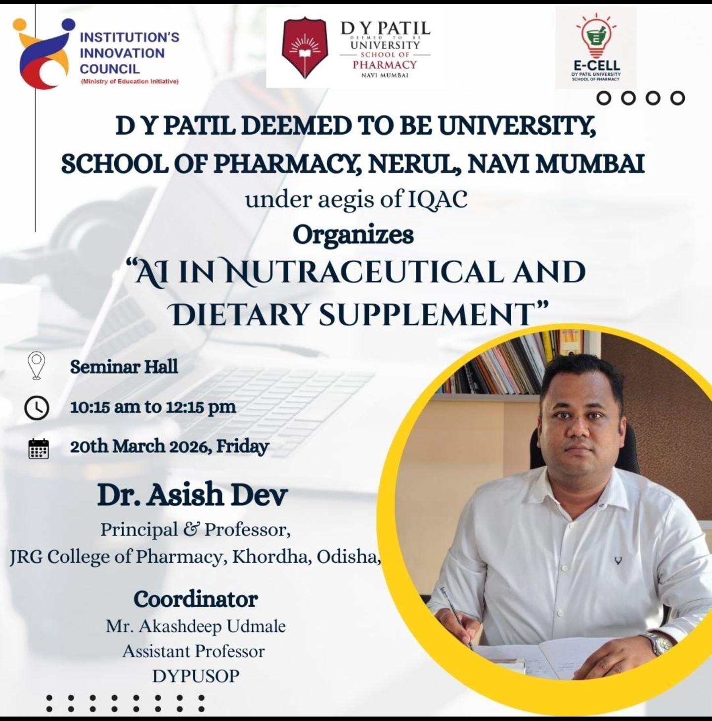 We are proud to share that our esteemed Principal, Dr. Asish Dev, delivered an insightful online session on “AI in Nutraceuticals and Dietary Supplements” for the students of the School of Pharmacy, D Y Patil Deemed to be University, Nerul, Navi Mumbai.